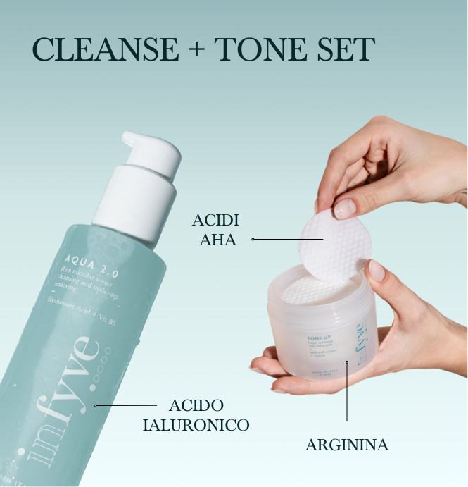 Si prosegue con l'applicazione del tonico in dischetti TONE.UP, ad azione gentilmente esfoliante, che lascia la pelle levigata e luminosa. Il Betaglucano e l'Arginina favoriscono l'azione idratante e lenitiva, ed il ripristino del PH cutaneo.