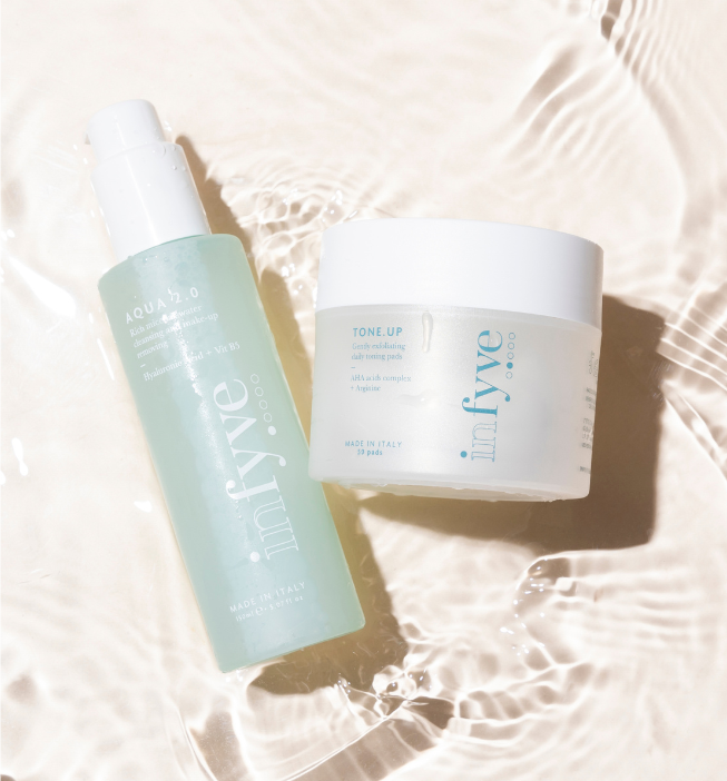 Una breve routine per prendersi cura della propria pelle, rendendola liscia e vellutata: strucca e detergi con AQUA 2.0, il detergente micellare arricchito con Acido Ialuronico e Pantenolo, e applica il tonico in dischetti pre-imbevuti TONE.UP, ad azione gentilmente esfoliante.