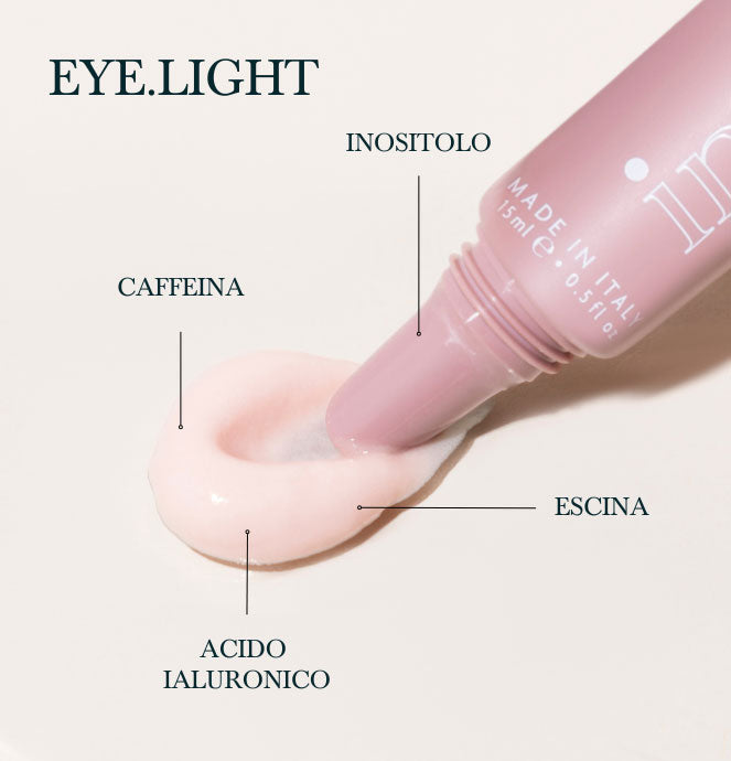 Certo, EYE.LIGHT contiene Caffeina, Escina e Inositolo che favoriscono il micro-circolo e riducono la presenza di borse e occhiaie.